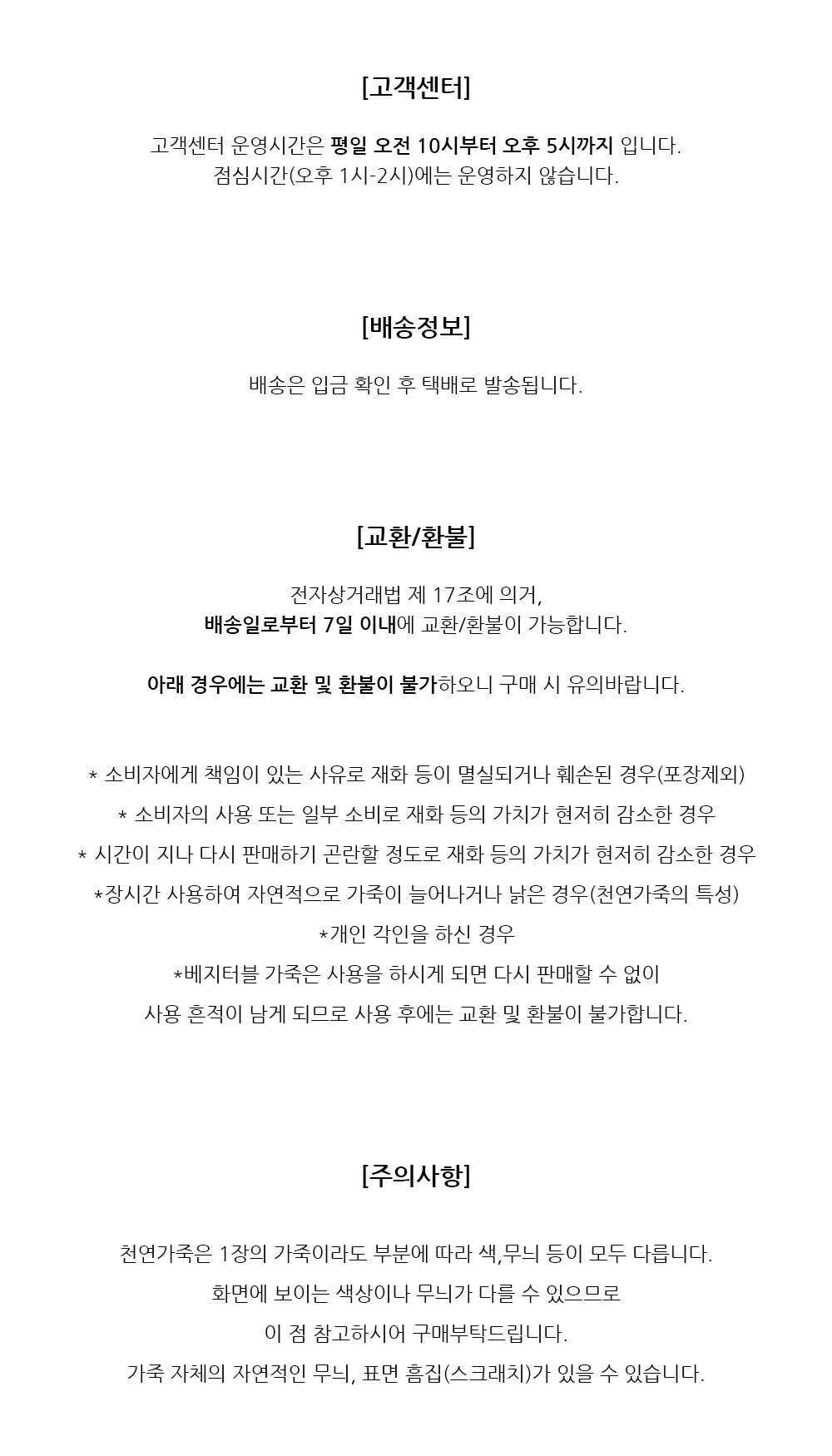 상품상세설명에 배송/교환/반품/취소 관련 안내가 기재된 경우 다음 안내사항보다 우선 적용됩니다.