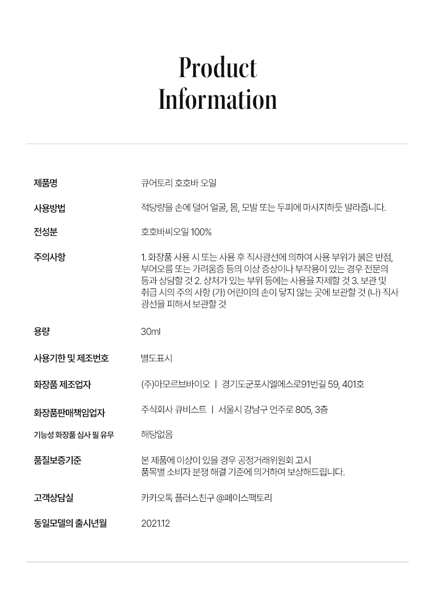 | 제조연월 및 유통기한 | 제조연월일로부터 12 개월까지(2021년 10월 31일 이후 제조된 상품만을 취급) |
