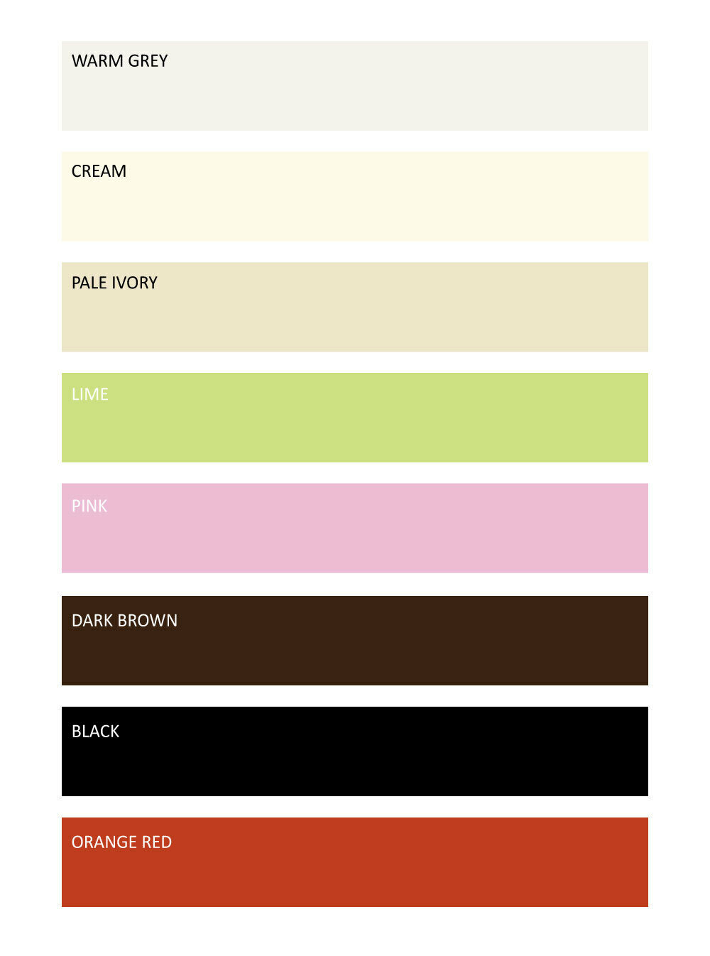 | 색상 | lime, pink, warm grey, cream, pale ivory, black, dark brown, orange red |