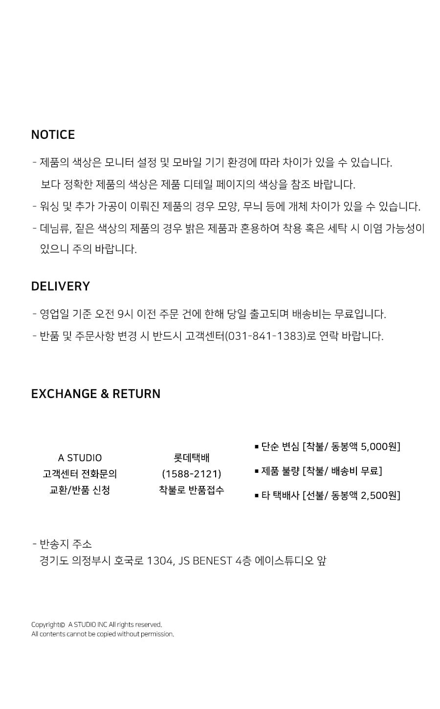 상품상세설명에 배송/교환/반품/취소 관련 안내가 기재된 경우 다음 안내사항보다 우선 적용됩니다.