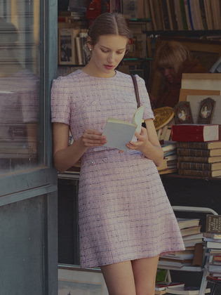 LINDSAY Round neck semi A-line tweed mini dress (Minty blue&White/Deep navy/Pink)