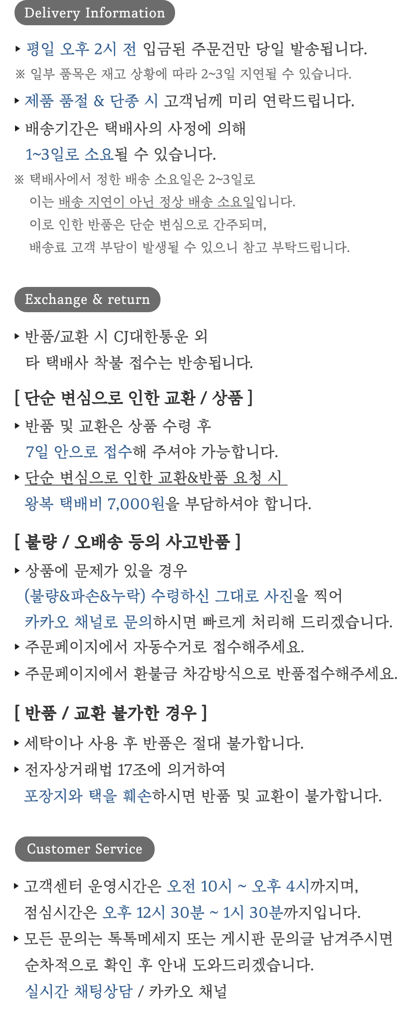 상품상세설명에 배송/교환/반품/취소 관련 안내가 기재된 경우 다음 안내사항보다 우선 적용됩니다.