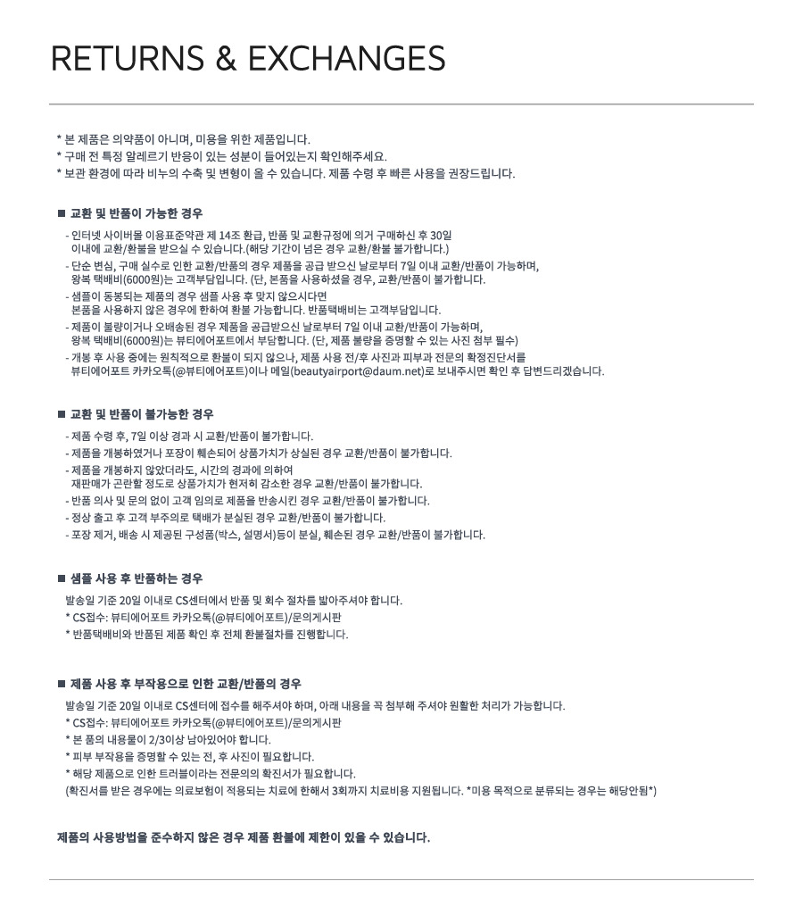 | 판매자 귀책에 따른 반품기준 | 전자상거래 등에서의 소비자보호에 관한 법률의 청약철회 기한 내 업체 과실이나 제품 불량 확인 시 반품비용 무료 |
