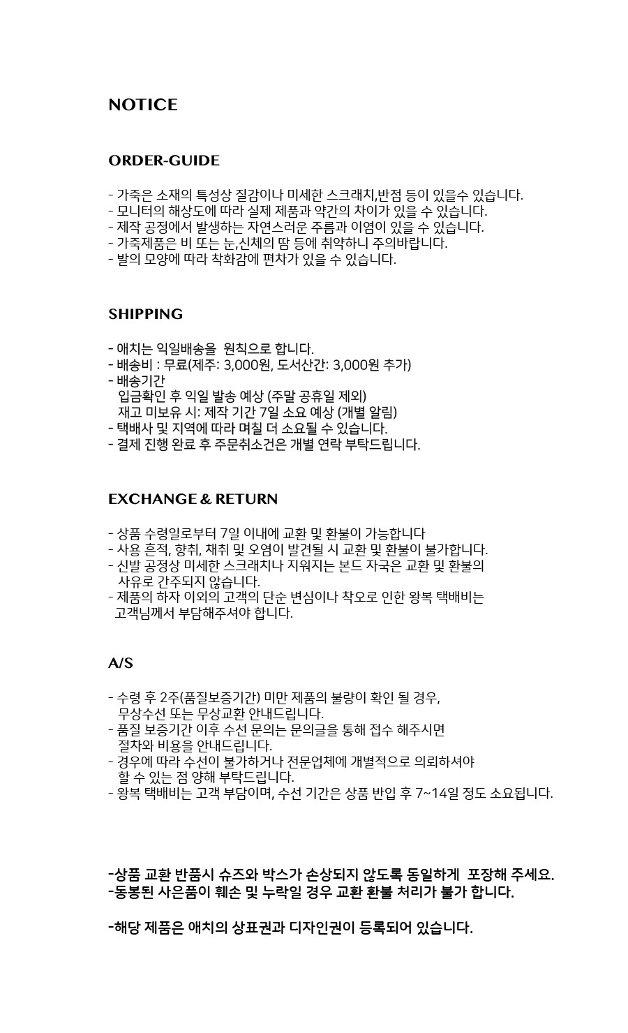상품상세설명에 배송/교환/반품/취소 관련 안내가 기재된 경우 다음 안내사항보다 우선 적용됩니다.