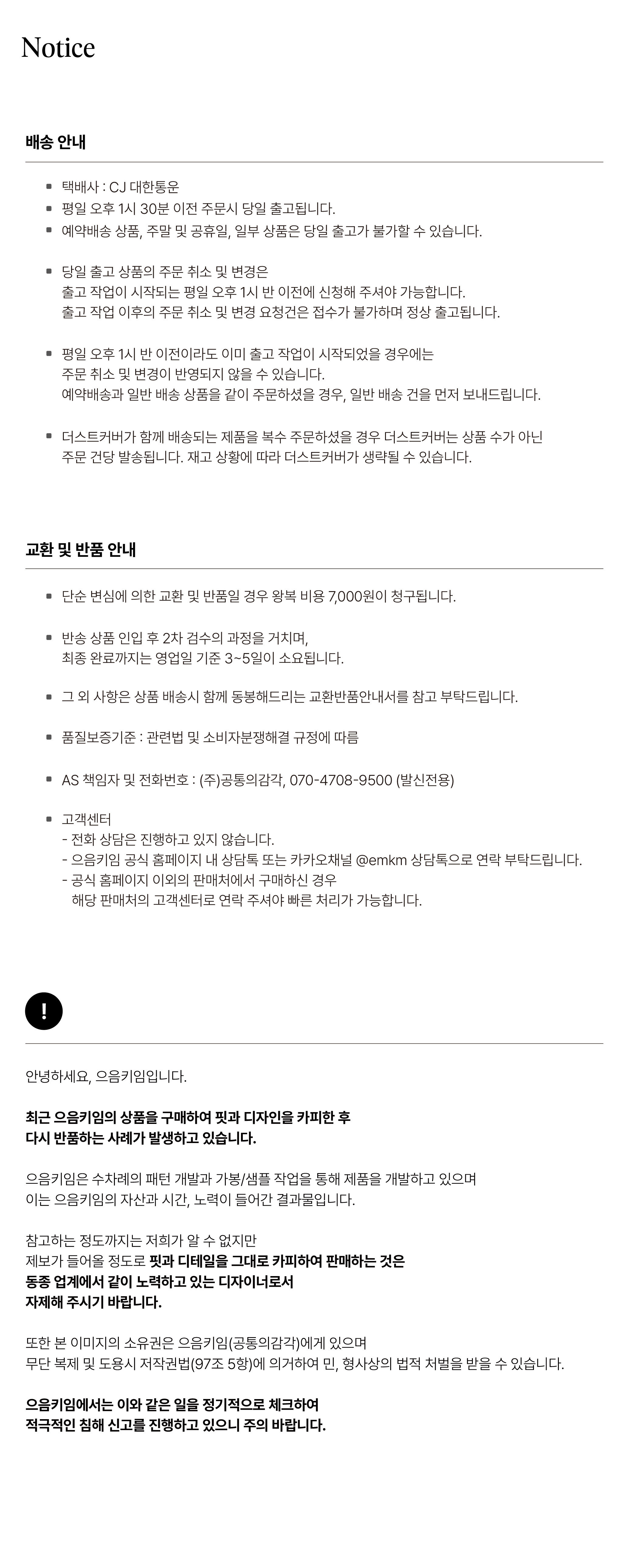 상품상세설명에 배송/교환/반품/취소 관련 안내가 기재된 경우 다음 안내사항보다 우선 적용됩니다.