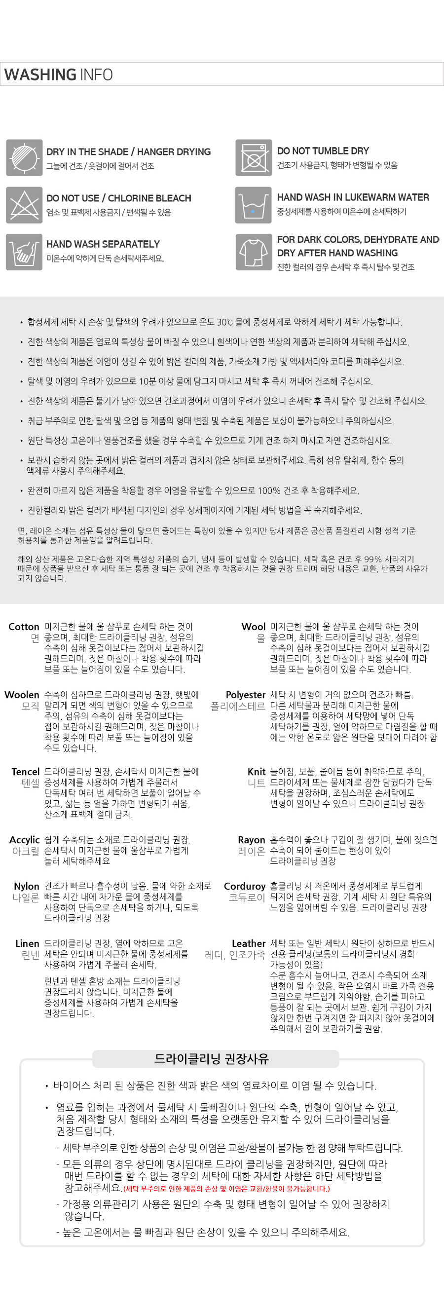| 세탁방법 및 취급시 주의사항 | 상품 품질표시 및 상품상세정보 참고 |