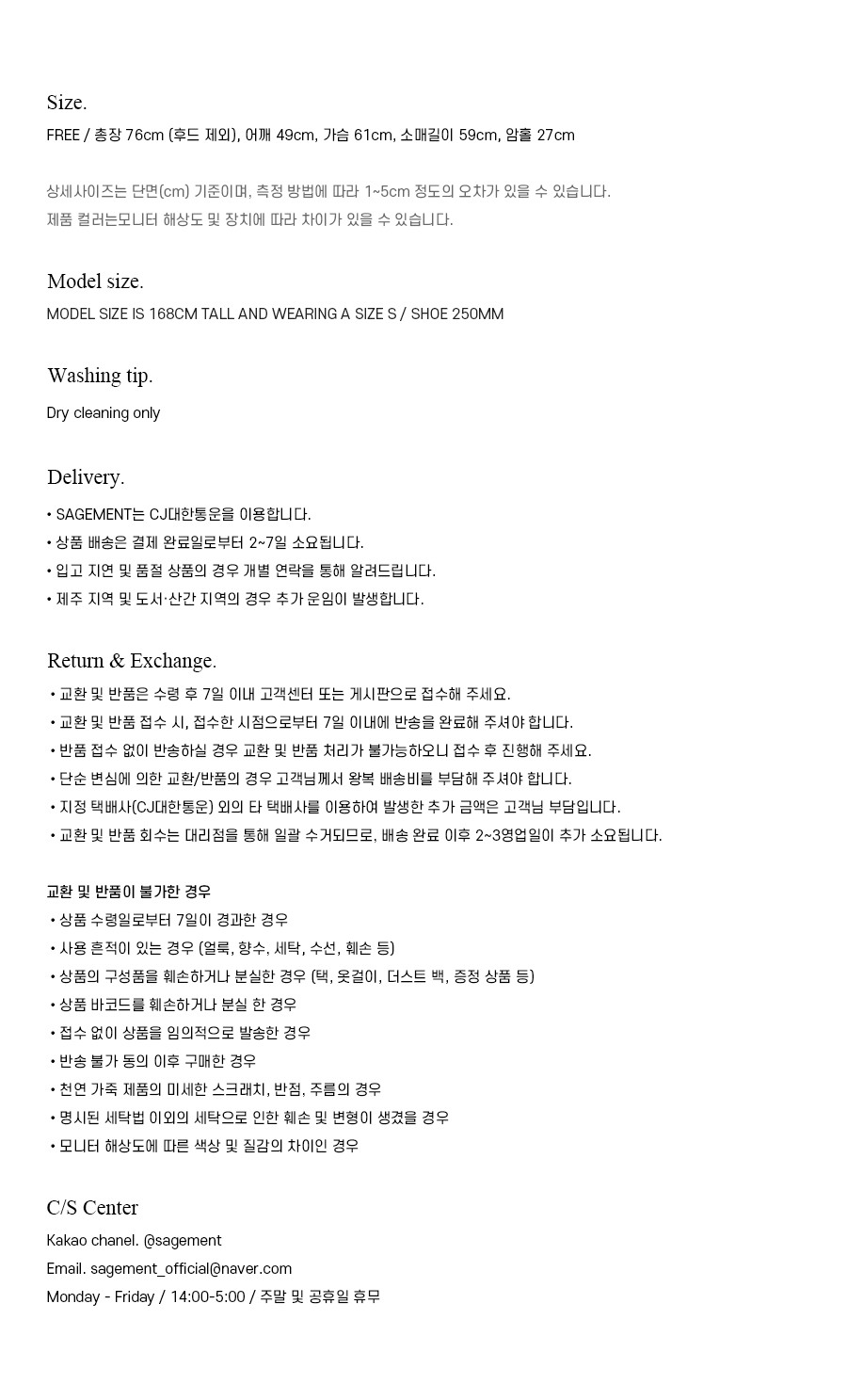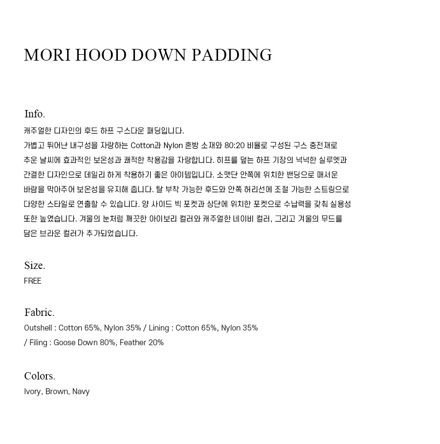 | 소재 | Outshell : Cotton 65%, Nylon 35% / Lining : Cotton 65%, Nylon 35% / Filing : Goose Down 80%, Feather |